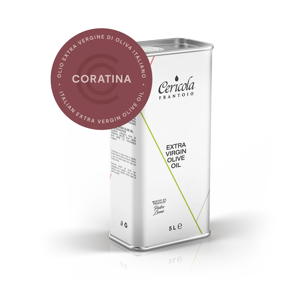 Olio extravergine 100% italiano Coratina, denocciolato e spremuto a freddo. Latta da 5L